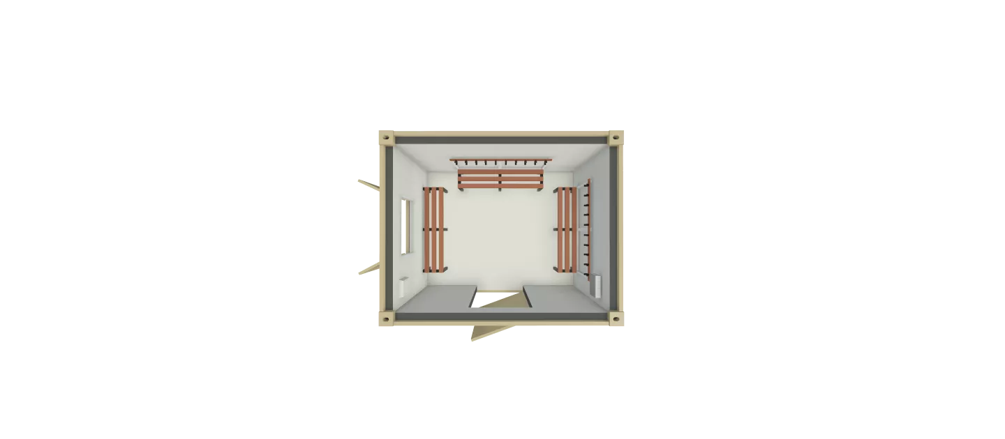 The cabin is designed to support fast, reliable drying of wet clothing and PPE. Fixed seating benches and hanging spaces allow clothes to be stored neatly, resulting in effective drying.